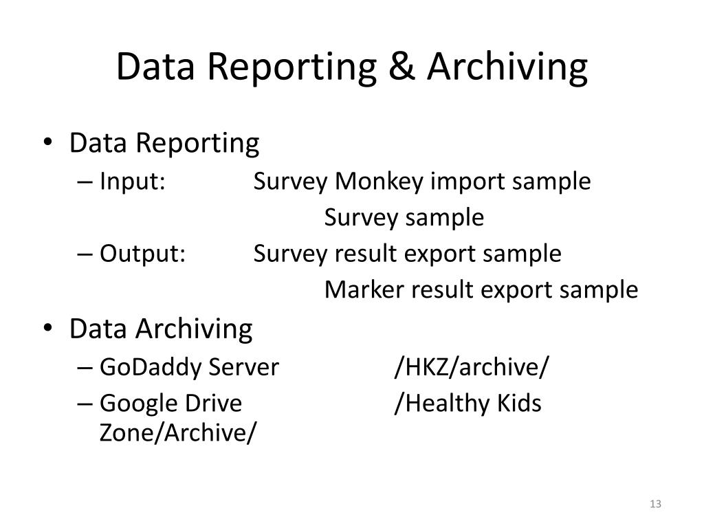 Data Reporting & Archiving • Data Reporting • Input: Survey Monkey import sample Survey sample • Output: Survey result export sample Marker result export sample • Data Archiving • GoDaddy Server /HKZ/archive/ • Google Drive /Healthy Kids Zone/Archive/