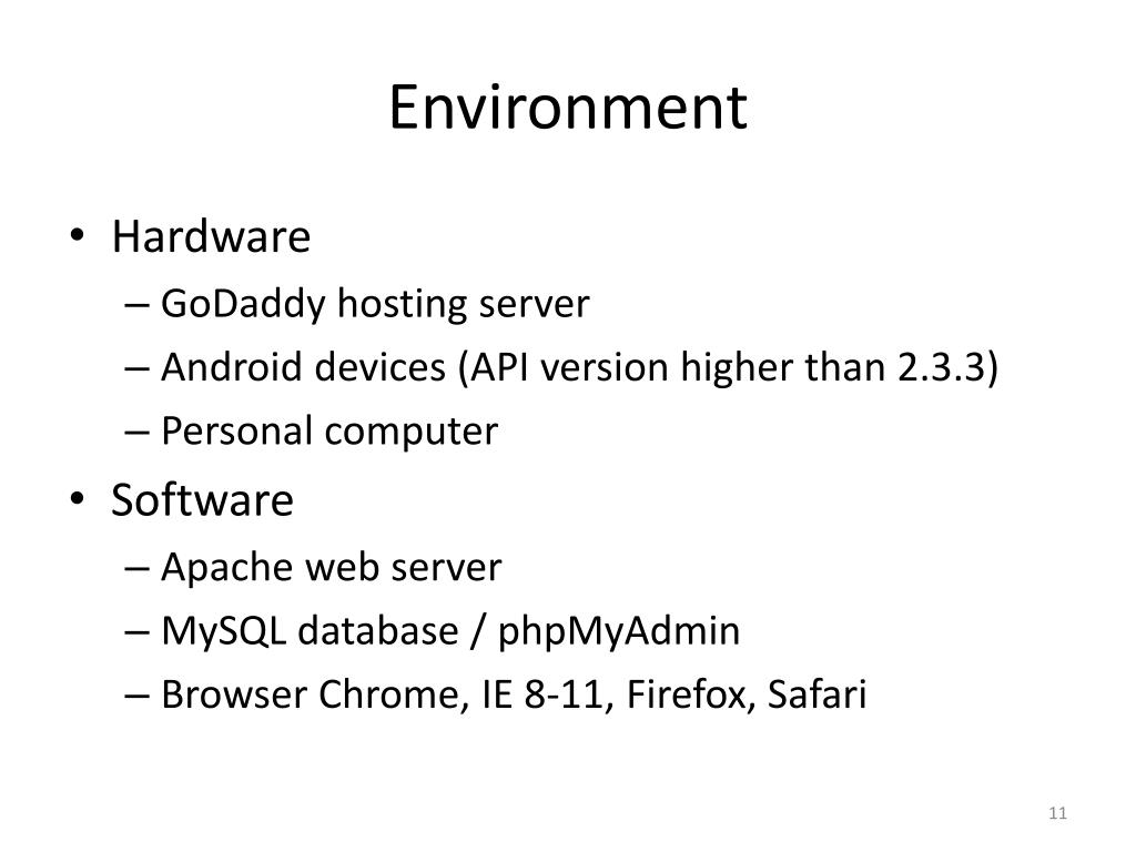 Environment • Hardware • GoDaddy hosting server • Android devices (API version higher than 2.3.3) • Personal computer • Software • Apache web server • MySQL database / phpMyAdmin • Browser Chrome, IE 8-11, Firefox, Safari
