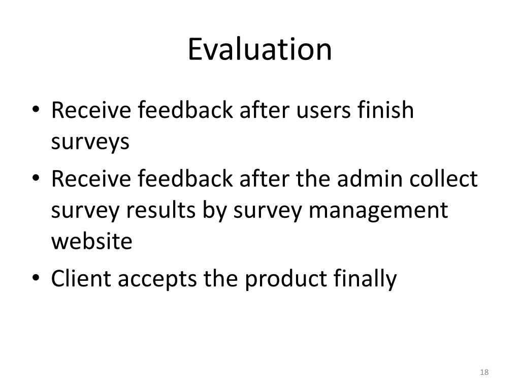 Evaluation • Receive feedback after users finish surveys • Receive feedback after the admin collect survey results by survey management website • Client accepts the product finally