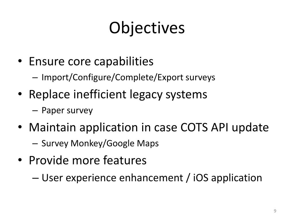 Objectives • Ensure core capabilities • Import/Configure/Complete/Export surveys • Replace inefficient legacy systems • Paper survey • Maintain application in case COTS API update • Survey Monkey/Google Maps • Provide more features • User experience enhancement / iOS application