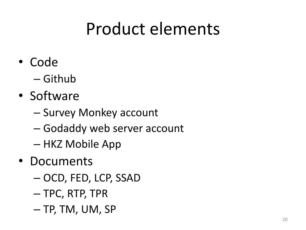 Product elements • Code • Github • Software • Survey Monkey account • Godaddy web server account • HKZ Mobile App • Documents • OCD, FED, LCP, SSAD • TPC, RTP, TPR • TP, TM, UM, SP