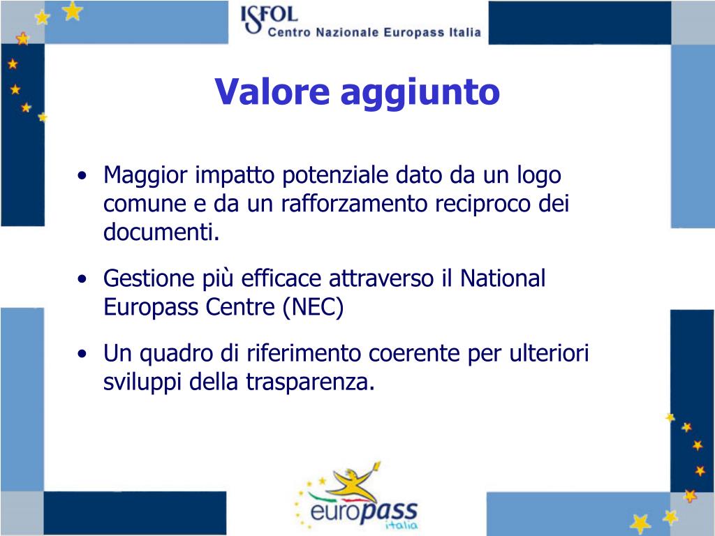 Valore aggiunto • Maggior impatto potenziale dato da un logo comune e da un rafforzamento reciproco dei documenti. • Gestione più efficace attraverso il National Europass Centre (NEC) • Un quadro di riferimento coerente per ulteriori sviluppi della trasparenza.