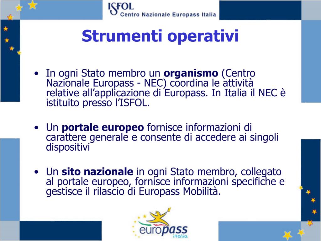 Strumenti operativi • In ogni Stato membro un organismo (Centro Nazionale Europass - NEC) coordina le attività relative all’applicazione di Europass. In Italia il NEC è istituito presso l’ISFOL. • Un portale europeo fornisce informazioni di carattere generale e consente di accedere ai singoli dispositivi • Un sito nazionale in ogni Stato membro, collegato al portale europeo, fornisce informazioni specifiche e gestisce il rilascio di Europass Mobilità.