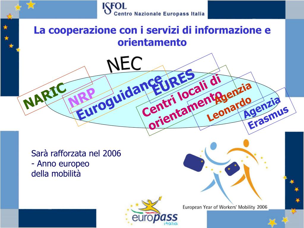 La cooperazione con i servizi di informazione e orientamento NEC EURES NARIC Centri locali di orientamento NRP Agenzia Leonardo Euroguidance Agenzia Erasmus Sarà rafforzata nel 2006 - Anno europeo della mobilità