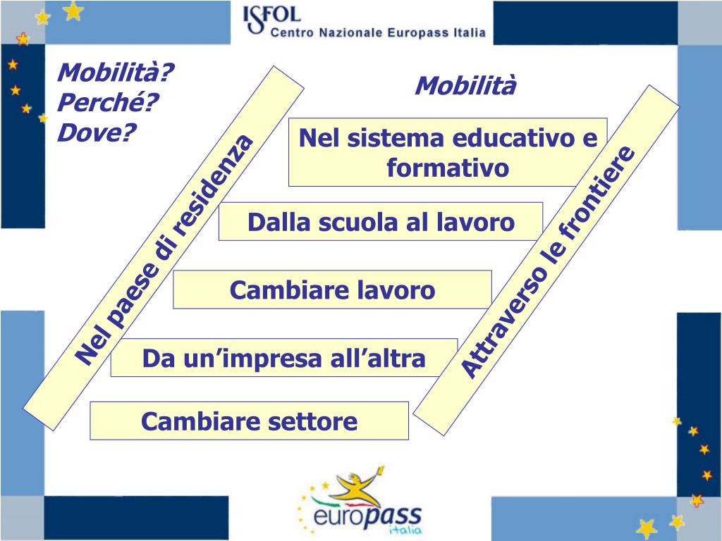 Mobilità?Perché?Dove? Mobilità Nel sistema educativo e formativo Dalla scuola al lavoro Nel paese di residenza Attraverso le frontiere Cambiare lavoro Da un’impresa all’altra Cambiare settore