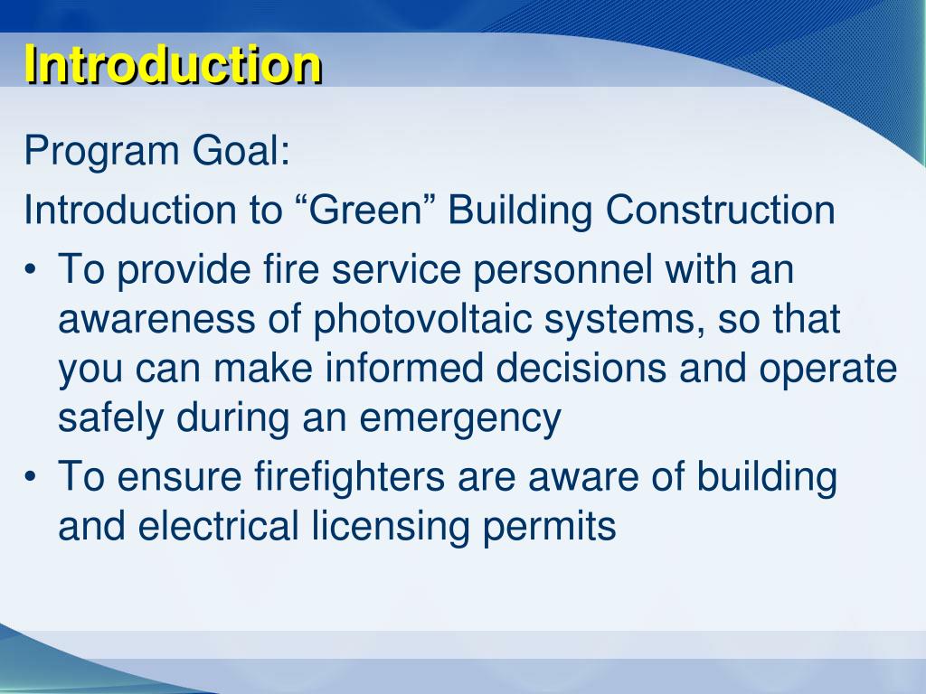 Introduction Program Goal: Introduction to “Green” Building Construction • To provide fire service personnel with an awareness of photovoltaic systems, so that you can make informed decisions and operate safely during an emergency • To ensure firefighters are aware of building and electrical licensing permits