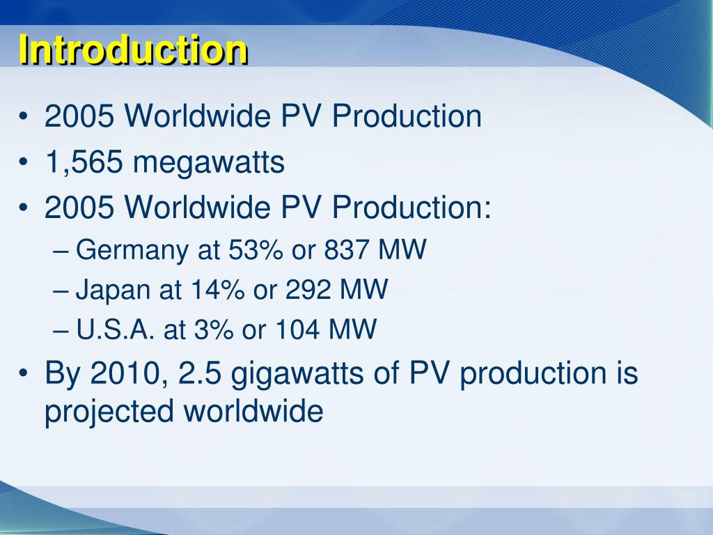 Introduction • 2005 Worldwide PV Production • 1,565 megawatts • 2005 Worldwide PV Production: • Germany at 53% or 837 MW • Japan at 14% or 292 MW • U.S.A. at 3% or 104 MW • By 2010, 2.5 gigawatts of PV production is projected worldwide