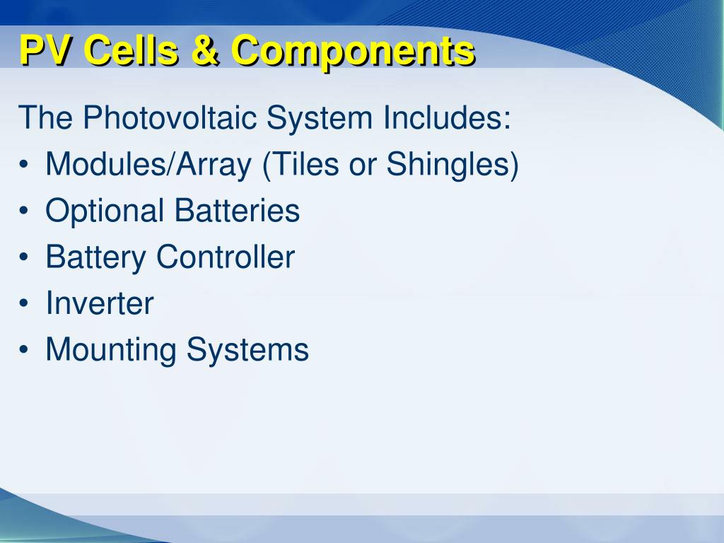 PV Cells & Components The Photovoltaic System Includes: • Modules/Array (Tiles or Shingles) • Optional Batteries • Battery Controller • Inverter • Mounting Systems