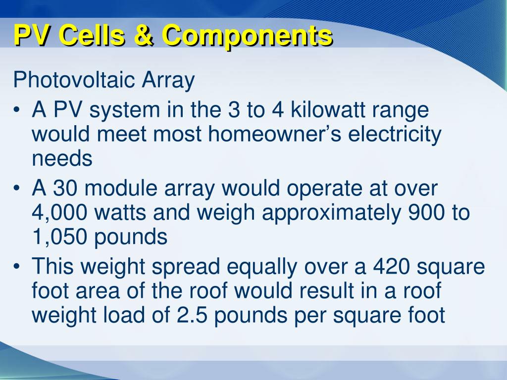 PV Cells & Components Photovoltaic Array • A PV system in the 3 to 4 kilowatt range would meet most homeowner’s electricity needs • A 30 module array would operate at over 4,000 watts and weigh approximately 900 to 1,050 pounds • This weight spread equally over a 420 square foot area of the roof would result in a roof weight load of 2.5 pounds per square foot