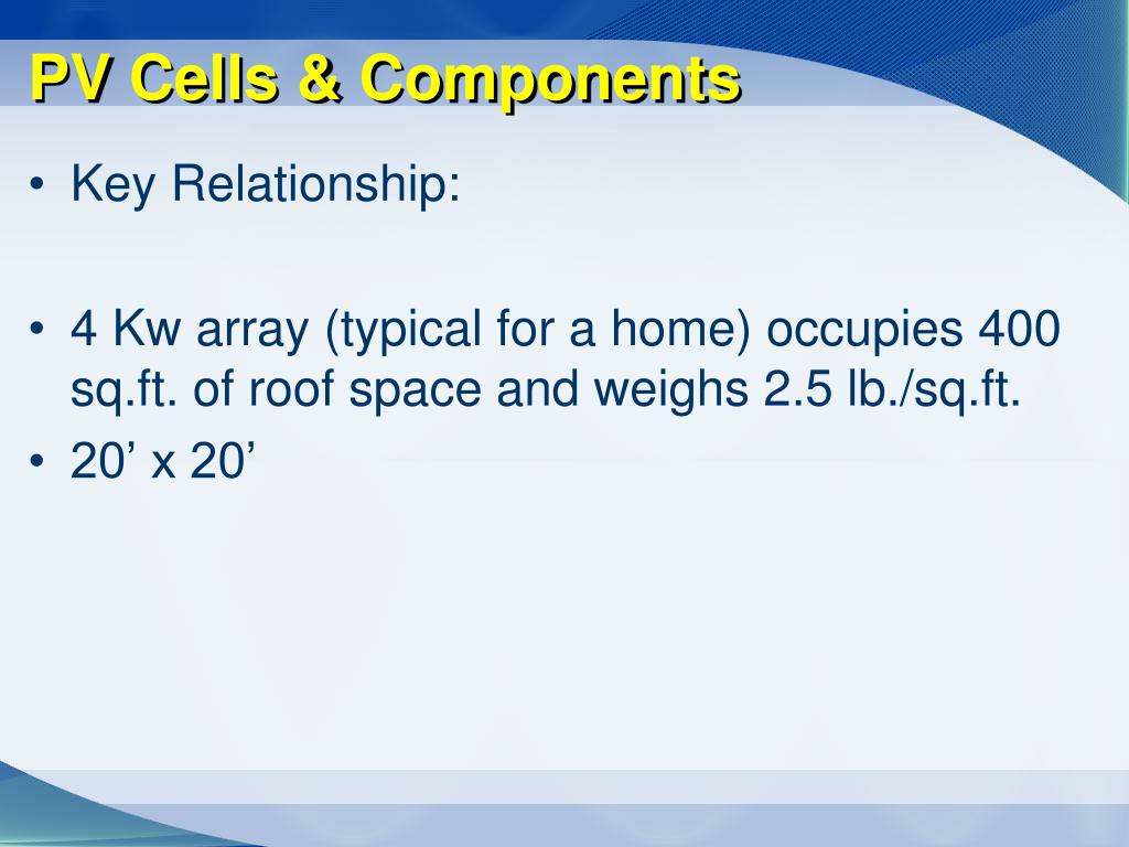 PV Cells & Components Key Relationship: 4 Kw array (typical for a home) occupies 400 sq.ft. of roof space and weighs 2.5 lb./sq.ft. 20’ x 20’