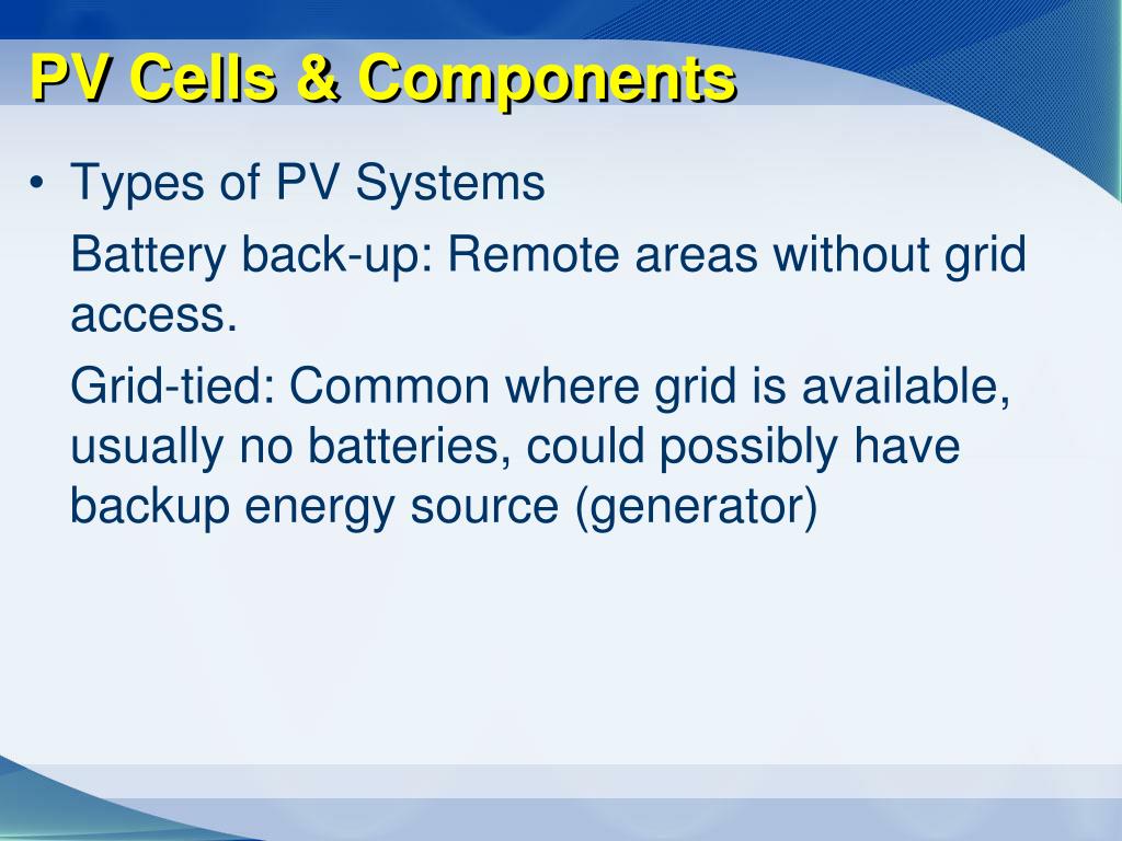 PV Cells & Components • Types of PV Systems Battery back-up: Remote areas without grid access. Grid-tied: Common where grid is available, usually no batteries, could possibly have backup energy source (generator)