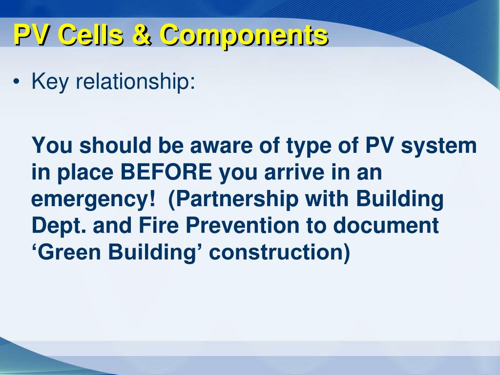 PV Cells & Components • Key relationship: You should be aware of type of PV system in place BEFORE you arrive in an emergency! (Partnership with Building Dept. and Fire Prevention to document ‘Green Building’ construction)