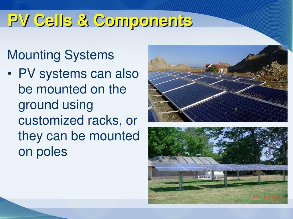 PV Cells & Components Mounting Systems • PV modules can be mounted directly on the roof, in many cases specialized roof racks lift the array from the roof deck allowing air to circulate under the modules • Many PV systems are designed to withstand 80 mile per hour winds