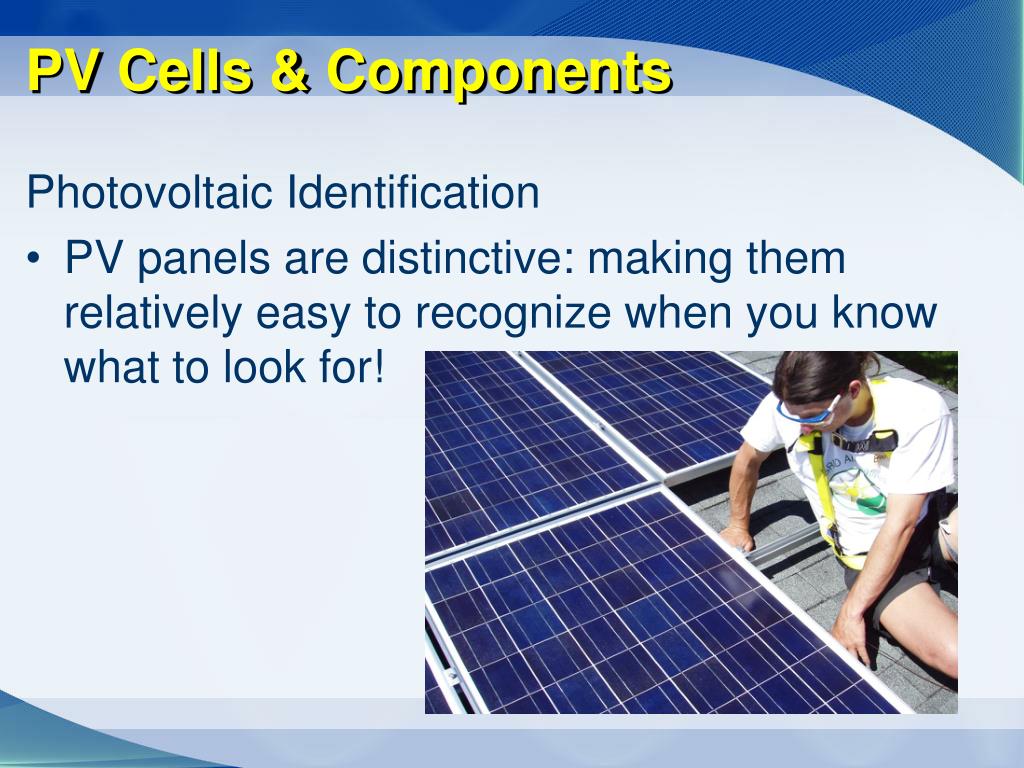PV Cells & Components Photovoltaic Identification • PV panels are distinctive: making them relatively easy to recognize when you know what to look for!
