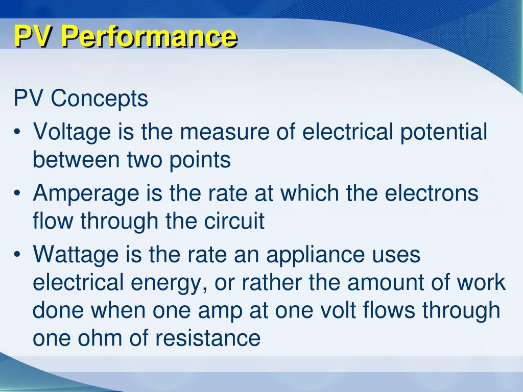 PV Performance PV Concepts • Voltage is the measure of electrical potential between two points • Amperage is the rate at which the electrons flow through the circuit • Wattage is the rate an appliance uses electrical energy, or rather the amount of work done when one amp at one volt flows through one ohm of resistance