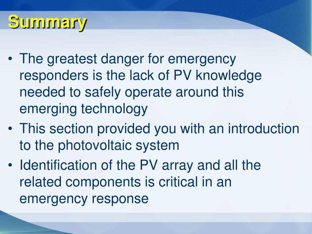 Summary • The greatest danger for emergency responders is the lack of PV knowledge needed to safely operate around this emerging technology • This section provided you with an introduction to the photovoltaic system • Identification of the PV array and all the related components is critical in an emergency response