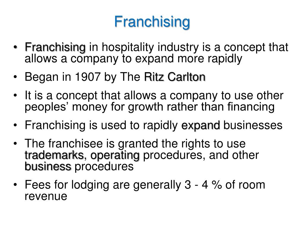 Franchising • Franchisingin hospitality industry is a concept that allows a company to expand more rapidly • Began in 1907 by The Ritz Carlton • It is a concept that allows a company to use other peoples’ money for growth rather than financing • Franchising is used to rapidly expand businesses • The franchisee is granted the rights to use trademarks, operating procedures, and other business procedures • Fees for lodging are generally 3 - 4% of room revenue