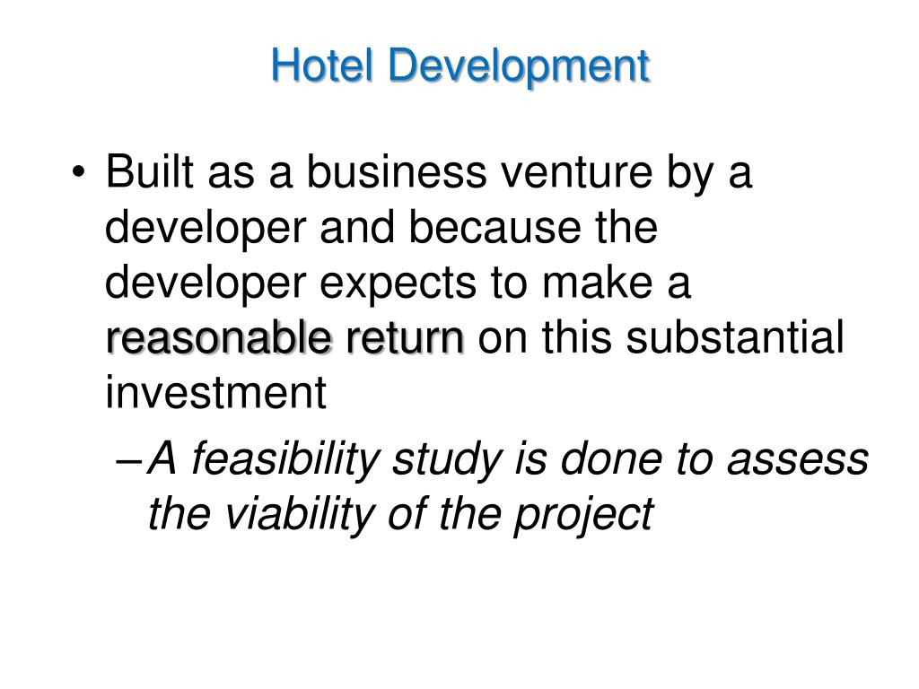 Hotel Development • Built as a business venture by a developer and because the developer expects to make a reasonablereturn on this substantial investment • A feasibility study is done to assess the viability of the project