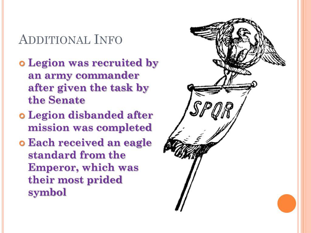 Additional Info • Legion was recruited by an army commander after given the task by the Senate • Legion disbanded after mission was completed • Each received an eagle standard from the Emperor, which was their most prided symbol