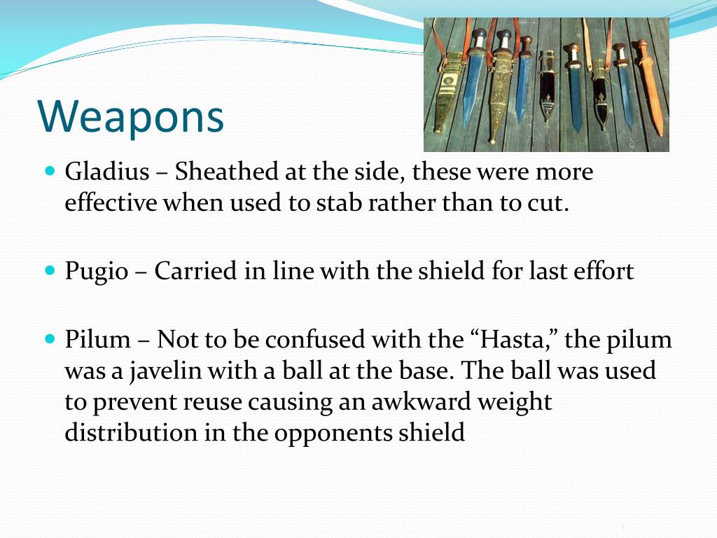Weapons • Gladius – Sheathed at the side, these were more effective when used to stab rather than to cut. • Pugio – Carried in line with the shield for last effort • Pilum – Not to be confused with the “Hasta,” the pilum was a javelin with a ball at the base. The ball was used to prevent reuse causing an awkward weight distribution in the opponents shield penis