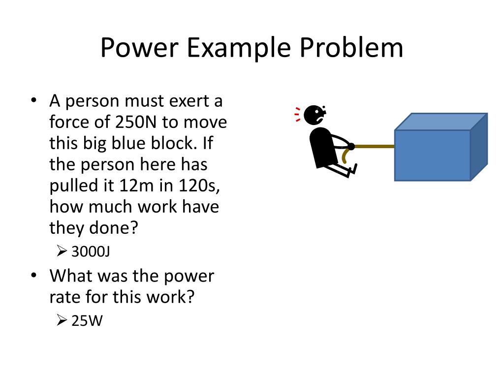 Power Example Problem • A person must exert a force of 250N to move this big blue block. If the person here has pulled it 12m in 120s, how much work have they done? • 3000J • What was the power rate for this work? • 25W