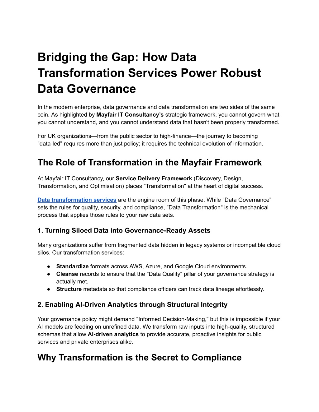 Bridging the Gap: How Data Transformation Services Power Robust Data Governance In the modern enterprise, data governance and data transformation are two sides of the same coin. As highlighted by Mayfair IT Consultancy’s strategic framework, you cannot govern what you cannot understand, and you cannot understand data that hasn't been properly transformed. For UK organizations—from the public sector to high-finance—the journey to becoming "data-led" requires more than just policy; it requires the technical evolution of information. The Role of Transformation in the Mayfair Framework At Mayfair IT Consultancy, our Service Delivery Framework (Discovery, Design, Transformation, and Optimisation) places "Transformation" at the heart of digital success. Data transformation services are the engine room of this phase. While "Data Governance" sets the rules for quality, security, and compliance, "Data Transformation" is the mechanical process that applies those rules to your raw data sets. 1. Turning Siloed Data into Governance-Ready Assets Many organizations suffer from fragmented data hidden in legacy systems or incompatible cloud silos. Our transformation services: ● Standardize formats across AWS, Azure, and Google Cloud environments. ● Cleanse records to ensure that the "Data Quality" pillar of your governance strategy is actually met. ● Structure metadata so that compliance officers can track data lineage effortlessly. 2. Enabling AI-Driven Analytics through Structural Integrity Your governance policy might demand "Informed Decision-Making," but this is impossible if your AI models are feeding on unrefined data. We transform raw inputs into high-quality, structured schemas that allow AI-driven analytics to provide accurate, proactive insights for public services and private enterprises alike. Why Transformation is the Secret to Compliance