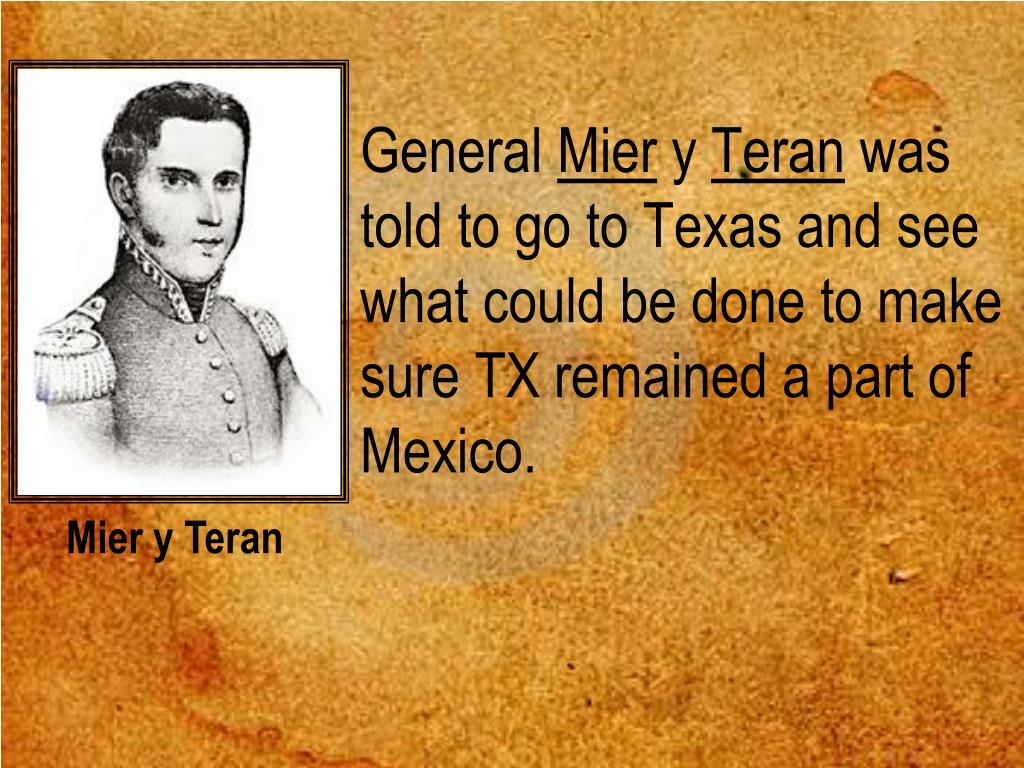 General Mier y Teran was told to go to Texas and see what could be done to make sure TX remained a part of Mexico. Mier y Teran
