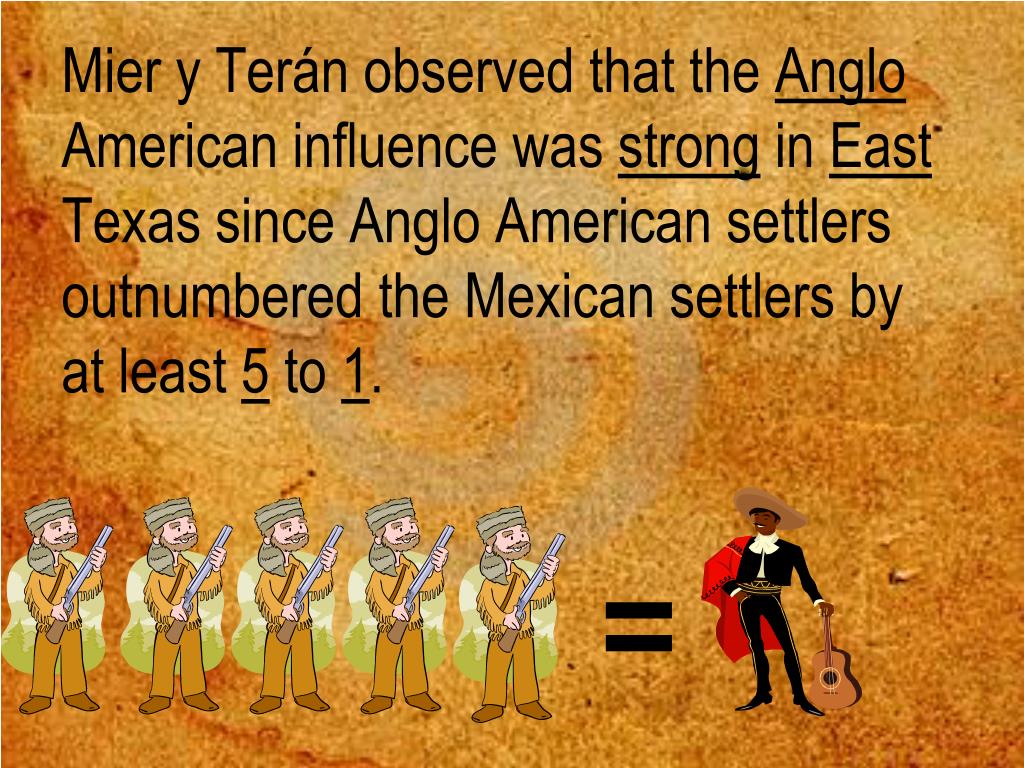 Mier y Terán observed that the Anglo American influence was strong in East Texas since Anglo American settlers outnumbered the Mexican settlers by at least 5 to 1. =