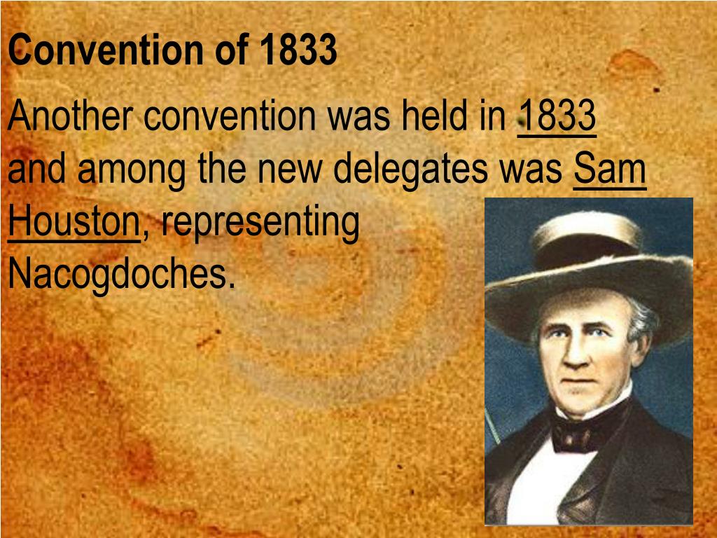 Convention of 1833 Another convention was held in 1833 and among the new delegates was SamHouston, representing Nacogdoches.