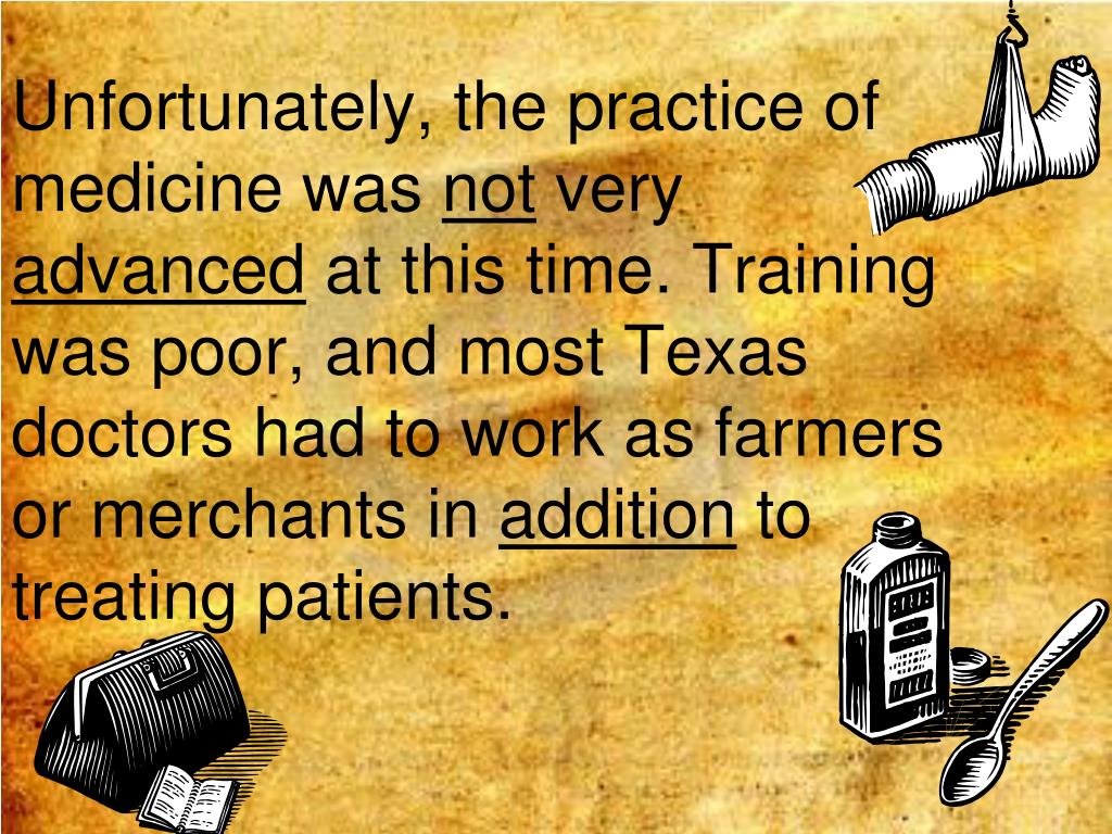 Unfortunately, the practice of medicine was not very advanced at this time. Training was poor, and most Texas doctors had to work as farmers or merchants in addition to treating patients.