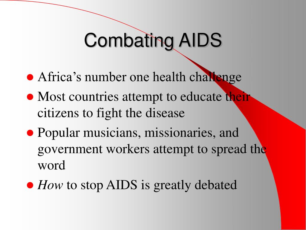 Combating AIDS • Africa’s number one health challenge • Most countries attempt to educate their citizens to fight the disease • Popular musicians, missionaries, and government workers attempt to spread the word • How to stop AIDS is greatly debated