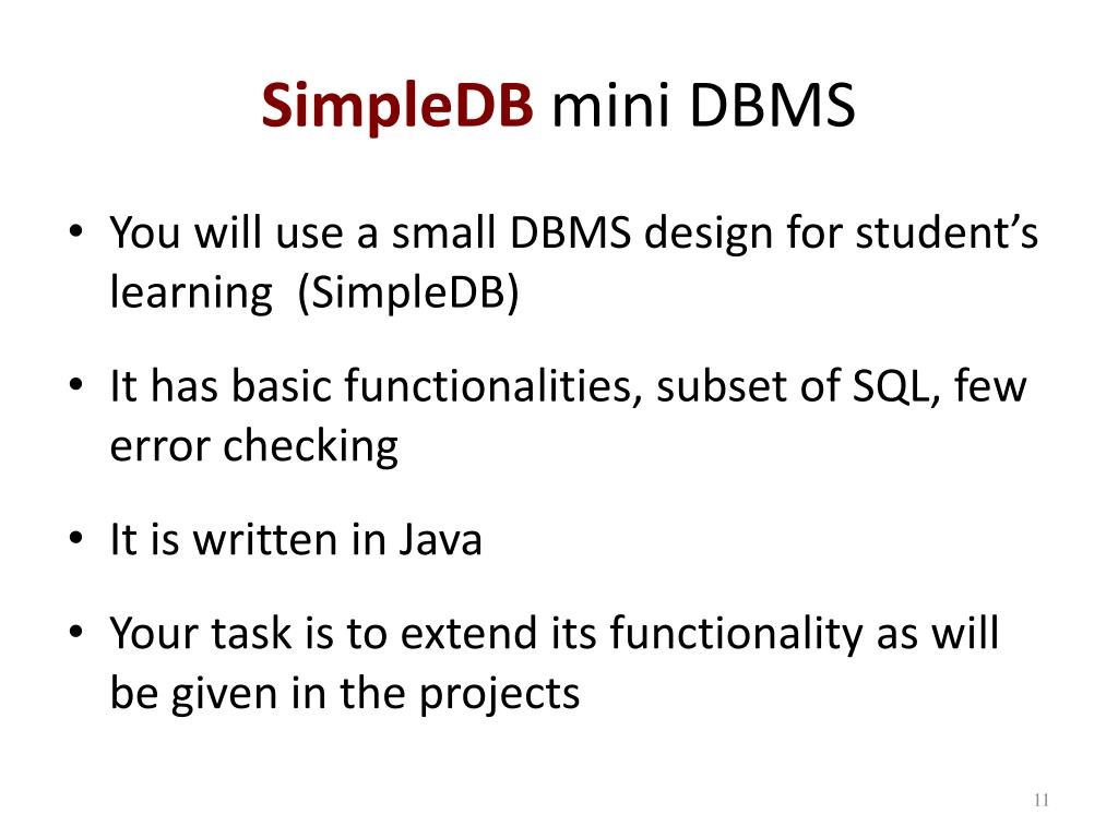 SimpleDBmini DBMS • You will use a small DBMS design for student’s learning (SimpleDB) • It has basic functionalities, subset of SQL, few error checking • It is written in Java • Your task is to extend its functionality as will be given in the projects