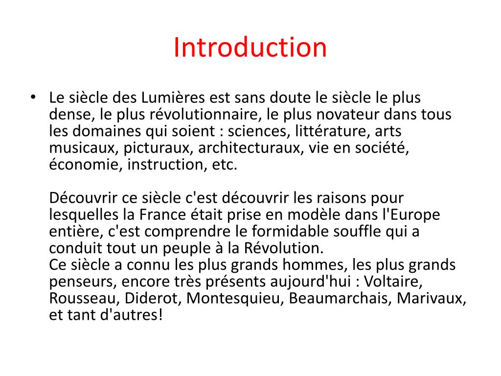 Introduction • Le siècle des Lumières est sans doute le siècle le plus dense, le plus révolutionnaire, le plus novateur dans tous les domaines qui soient : sciences, littérature, arts musicaux, picturaux, architecturaux, vie en société, économie, instruction, etc.Découvrir ce siècle c'est découvrir les raisons pour lesquelles la France était prise en modèle dans l'Europe entière, c'est comprendre le formidable souffle qui a conduit tout un peuple à la Révolution.Ce siècle a connu les plus grands hommes, les plus grands penseurs, encore très présents aujourd'hui : Voltaire, Rousseau, Diderot, Montesquieu, Beaumarchais, Marivaux, et tant d'autres!
