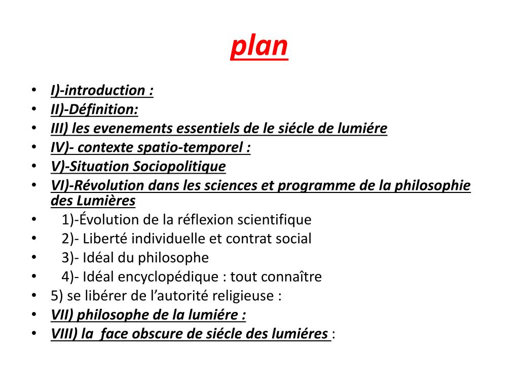 plan • I)-introduction : • II)-Définition: • III) les evenements essentiels de le siécle de lumiére • IV)- contexte spatio-temporel : • V)-Situation Sociopolitique • VI)-Révolution dans les sciences et programme de la philosophie des Lumières • 1)-Évolution de la réflexion scientifique • 2)- Liberté individuelle et contrat social • 3)- Idéal du philosophe • 4)- Idéal encyclopédique : tout connaître • 5) se libérer de l’autorité religieuse : • VII) philosophe de la lumiére : • VIII) la face obscure de siécle des lumiéres: