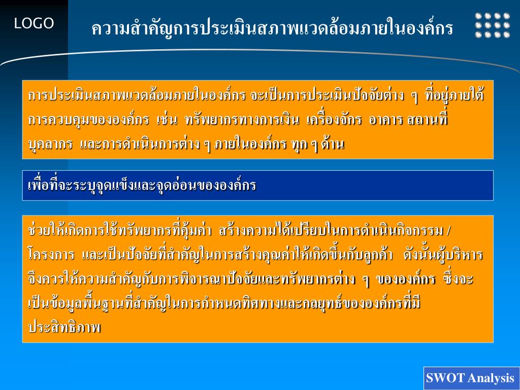 ความสำคัญการประเมินสภาพแวดล้อมภายในองค์กรความสำคัญการประเมินสภาพแวดล้อมภายในองค์กร การประเมินสภาพแวดล้อมภายในองค์กร จะเป็นการประเมินปัจจัยต่าง ๆ ที่อยู่ภายใต้ การควบคุมขององค์กร เช่น ทรัพยากรทางการเงิน เครื่องจักร อาคาร สถานที่ บุคลากร และการดำเนินการต่าง ๆ ภายในองค์กร ทุก ๆ ด้าน เพื่อที่จะระบุจุดแข็งและจุดอ่อนขององค์กร ช่วยให้เกิดการใช้ทรัพยากรที่คุ้มค่า สร้างความได้เปรียบในการดำเนินกิจกรรม /โครงการ และเป็นปัจจัยที่สำคัญในการสร้างคุณค่าให้เกิดขึ้นกับลูกค้า ดังนั้นผู้บริหารจึงควรให้ความสำคัญกับการพิจารณาปัจจัยและทรัพยากรต่าง ๆ ขององค์กร ซึ่งจะเป็นข้อมูลพื้นฐานที่สำคัญในการกำหนดทิศทางและกลยุทธ์ขององค์กรที่มีประสิทธิภาพ SWOT Analysis