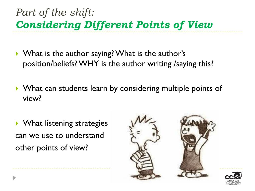 Part of the shift:Considering Different Points of View What is the author saying? What is the author’s position/beliefs? WHY is the author writing /saying this? What can students learn by considering multiple points of view? What listening strategies d can we use to understand other points of view?