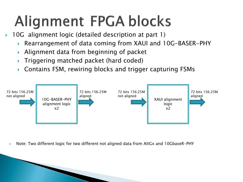 Alignment FPGAblocks • 10G alignment logic (detailed description at part 1) • Rearrangement of data coming from XAUI and 10G-BASER-PHY • Alignment data from beginning of packet • Triggering matched packet (hard coded) • Contains FSM, rewiring blocks and trigger capturing FSMs 10G-BASER-PHY alignment logic x2 XAUI alignment logic x2 72 bits 156.25M not aligned 72 bits 156.25M aligned 72 bits 156.25M not aligned 72 bits 156.25M aligned • Note: Two different logic for two different not aligned data from AltGx and 10GbaseR-PHY