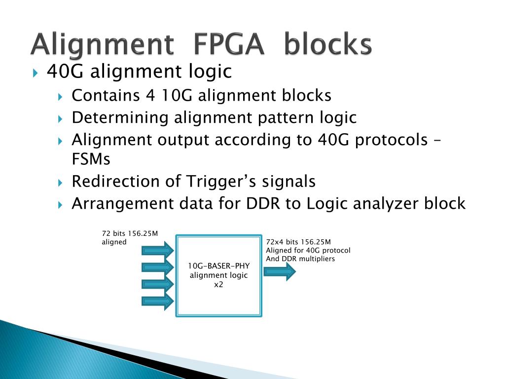 Alignment FPGA blocks • 40G alignment logic • Contains 4 10G alignment blocks • Determining alignment pattern logic • Alignment output according to 40G protocols – FSMs • Redirection of Trigger’s signals • Arrangement data for DDR to Logic analyzer block 72 bits 156.25M aligned 10G-BASER-PHY alignment logic x2 72x4 bits 156.25M Aligned for 40G protocol And DDR multipliers