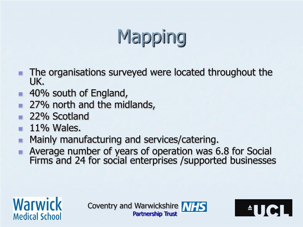 Mapping • The organisations surveyed were located throughout the UK. • 40% south of England, • 27% north and the midlands, • 22% Scotland • 11% Wales. • Mainly manufacturing and services/catering. • Average number of years of operation was 6.8 for Social Firms and 24 for social enterprises /supported businesses Coventry and Warwickshire Partnership Trust