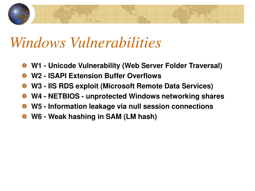 Windows Vulnerabilities • W1 - Unicode Vulnerability (Web Server Folder Traversal) • W2 - ISAPI Extension Buffer Overflows • W3 - IIS RDS exploit (Microsoft Remote Data Services) • W4 - NETBIOS - unprotected Windows networking shares • W5 - Information leakage via null session connections • W6 - Weak hashing in SAM (LM hash)