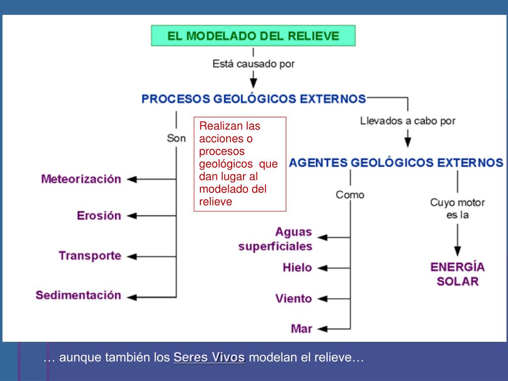 Realizan las acciones o procesos geológicos que dan lugar al modelado del relieve … aunque también los Seres Vivos modelan el relieve…