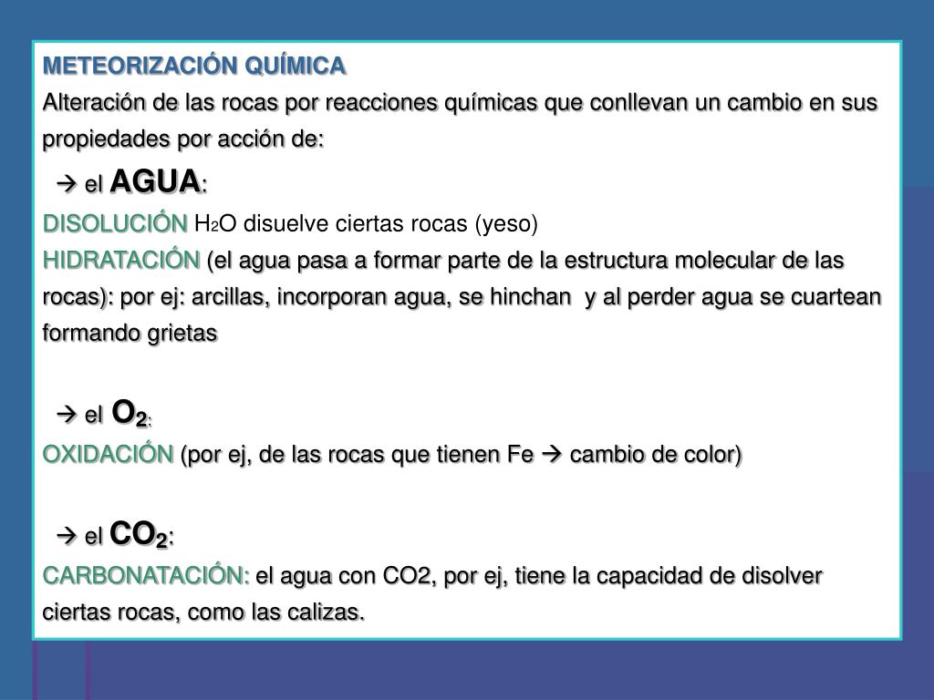 METEORIZACIÓN QUÍMICA Alteración de lasrocasporreaccionesquímicasqueconllevan un cambio en sus propiedadesporacción de: el AGUA: DISOLUCIÓNH2O disuelveciertasrocas (yeso) HIDRATACIÓN (el aguapasa a formar parte de la estructura molecular de lasrocas): porej: arcillas, incorporanagua, se hinchan y al perderagua se cuarteanformandogrietas el O2: OXIDACIÓN (porej, de lasrocasquetienen Fe cambio de color) el CO2: CARBONATACIÓN: el agua con CO2, porej, tiene la capacidad de disolverciertasrocas, comolascalizas.