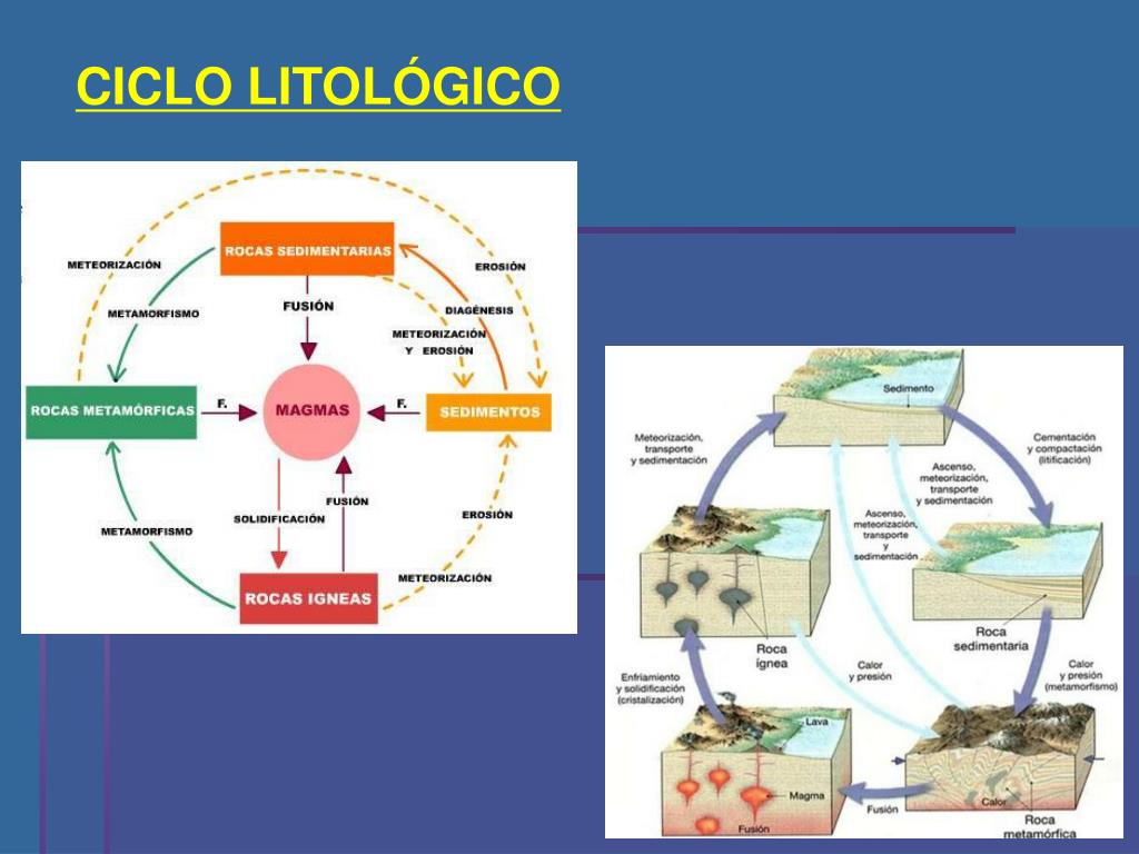 Volcánicas y plutónicas SOLIDIFICACIÓN MAGMA ROCAS MAGMÁTICAS O ÍGNEAS METAMORFISMO FUSIÓN EROSIÓN ROCAS METAMÓRFICAS EROSIÓN DERRUBIOS MINERALES METAMORFISMO Aumento Pr y Tª EROSIÓN SEDIMENTACIÓN SEDIMENTOS ROCAS SEDIMENTARIAS DIAGÉNESIS O LITIFICACIÓN Compactación y cementación