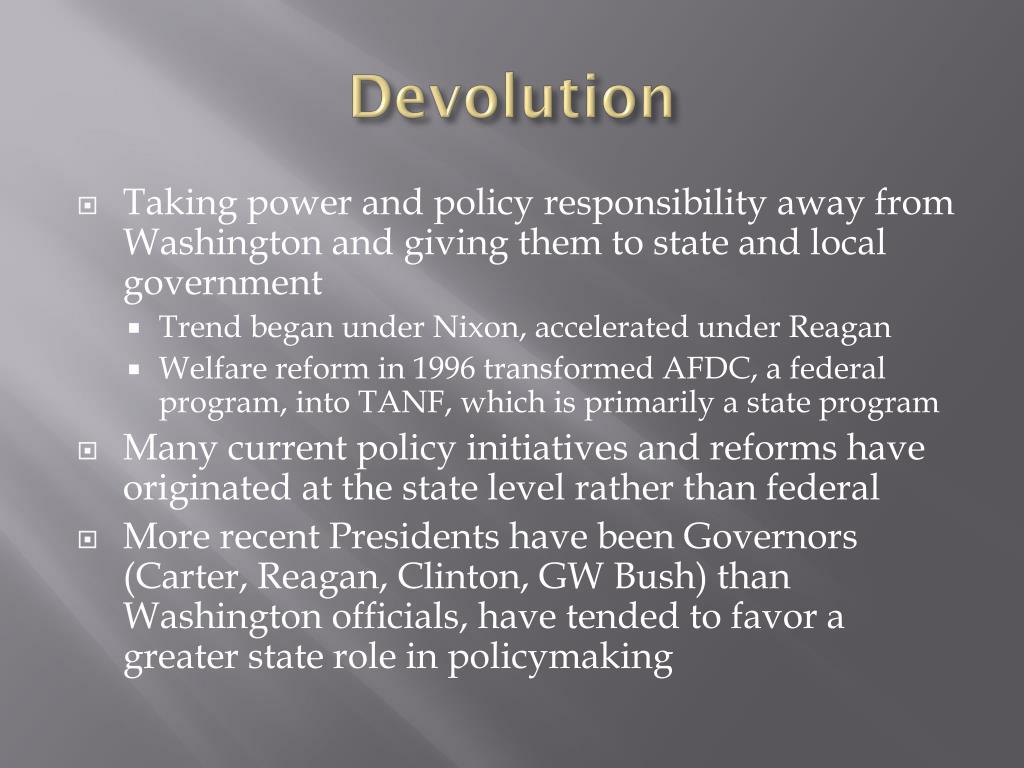Devolution • Taking power and policy responsibility away from Washington and giving them to state and local government • Trend began under Nixon, accelerated under Reagan • Welfare reform in 1996 transformed AFDC, a federal program, into TANF, which is primarily a state program • Many current policy initiatives and reforms have originated at the state level rather than federal • More recent Presidents have been Governors (Carter, Reagan, Clinton, GW Bush) than Washington officials, have tended to favor a greater state role in policymaking