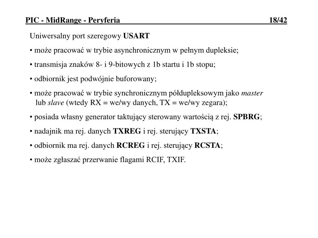 PIC - MidRange - Peryferia 18/42 • Uniwersalny port szeregowy USART • może pracować w trybie asynchronicznym w pełnym dupleksie; • transmisja znaków 8- i 9-bitowych z 1b startu i 1b stopu; • odbiornik jest podwójnie buforowany; • może pracować w trybie synchronicznym półdupleksowym jako master lub slave (wtedy RX = we/wy danych, TX = we/wy zegara); • posiada własny generator taktujący sterowany wartością z rej. SPBRG; • nadajnik ma rej. danych TXREG i rej. sterujący TXSTA; • odbiornik ma rej. danych RCREG i rej. sterujący RCSTA; • może zgłaszać przerwanie flagami RCIF, TXIF.
