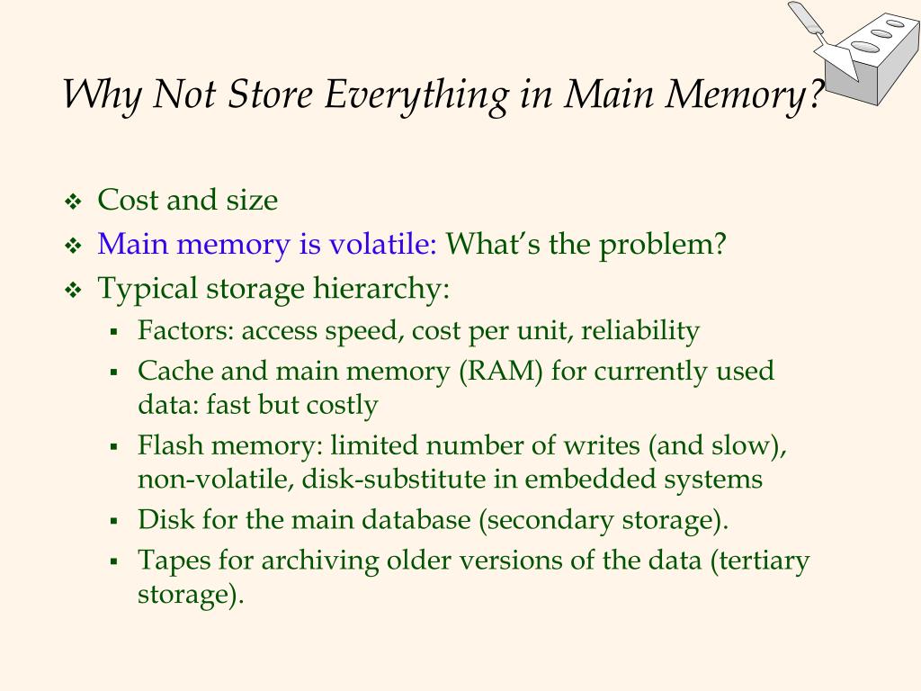 Why Not Store Everything in Main Memory? • Cost and size • Main memory is volatile:What’s the problem? • Typical storage hierarchy: • Factors: access speed, cost per unit, reliability • Cache and main memory (RAM) for currently used data: fast but costly • Flash memory: limited number of writes (and slow), non-volatile, disk-substitute in embedded systems • Disk for the main database (secondary storage). • Tapes for archiving older versions of the data (tertiary storage).