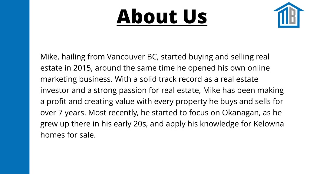 About Us Mike, hailing from Vancouver BC, started buying and selling real estate in 2015, around the same time he opened his own online marketing business. With a solid track record as a real estate investor and a strong passion for real estate, Mike has been making a profit and creating value with every property he buys and sells for over 7 years. Most recently, he started to focus on Okanagan, as he grew up there in his early 20s, and apply his knowledge for Kelowna homes for sale.