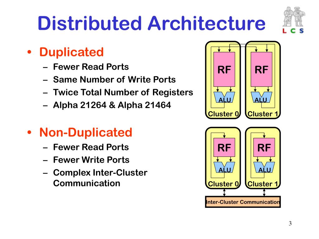 RF RF ALU ALU Cluster 0 Cluster 1 RF RF ALU ALU Cluster 0 Cluster 1 Inter-Cluster Communication Distributed Architecture • Duplicated • Fewer Read Ports • Same Number of Write Ports • Twice Total Number of Registers • Alpha 21264 & Alpha 21464 • Non-Duplicated • Fewer Read Ports • Fewer Write Ports • Complex Inter-Cluster Communication