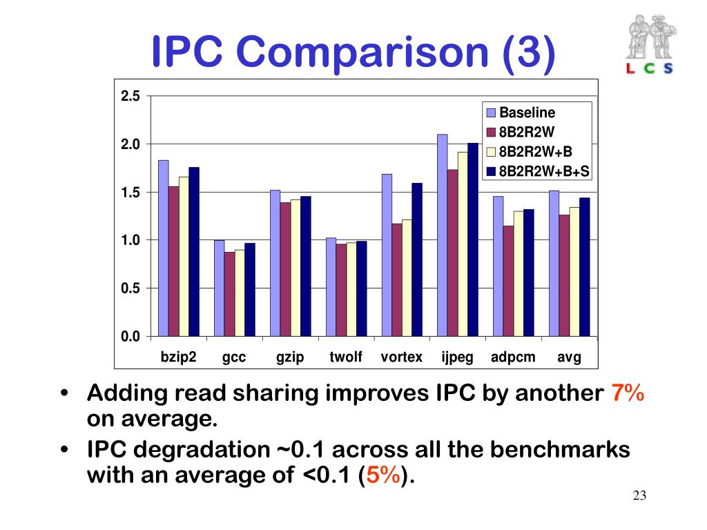 IPC Comparison (3) • Adding read sharing improves IPC by another 7% on average. • IPC degradation ~0.1 across all the benchmarks with an average of <0.1 (5%).