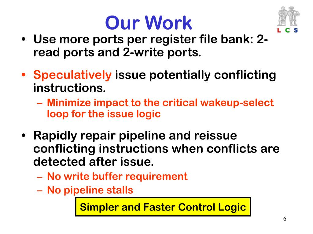 Our Work • Use more ports per register file bank: 2-read ports and 2-write ports. • Speculatively issue potentially conflicting instructions. • Minimize impact to the critical wakeup-select loop for the issue logic • Rapidly repair pipeline and reissue conflicting instructions when conflicts are detected after issue. • No write buffer requirement • No pipeline stalls Simpler and Faster Control Logic